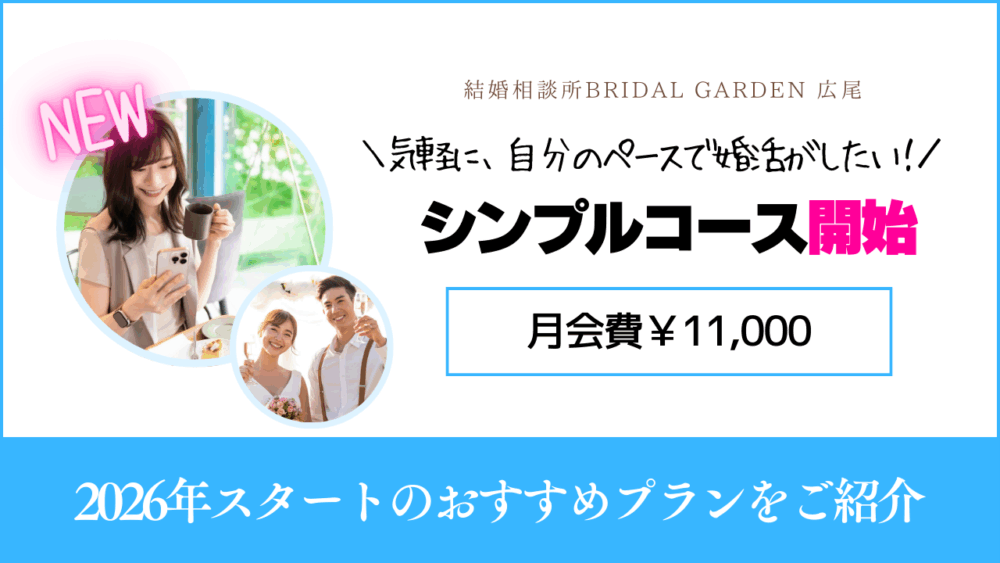 相談所婚活は、アドバイザーと二人三脚が結婚への1番の近道という考えは変わりませんが、「相談所婚活にチャレンジしてみたい!」というお気持ちに、ブライダルガーデンとしてもお応えしたいと考え、2026年シンプルコースを開設しました。